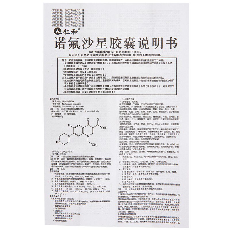 仁和 Капсула норфлоксацина 0,1 г*24 капсулы подходят для инфекций мочевыводящих путей, вызванных чувствительными бактериями, гонореей, простатитом, кишечником, брюшной тифойной лихорадкой и другими инфекциями сэндвичей