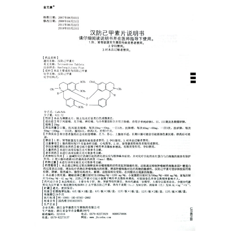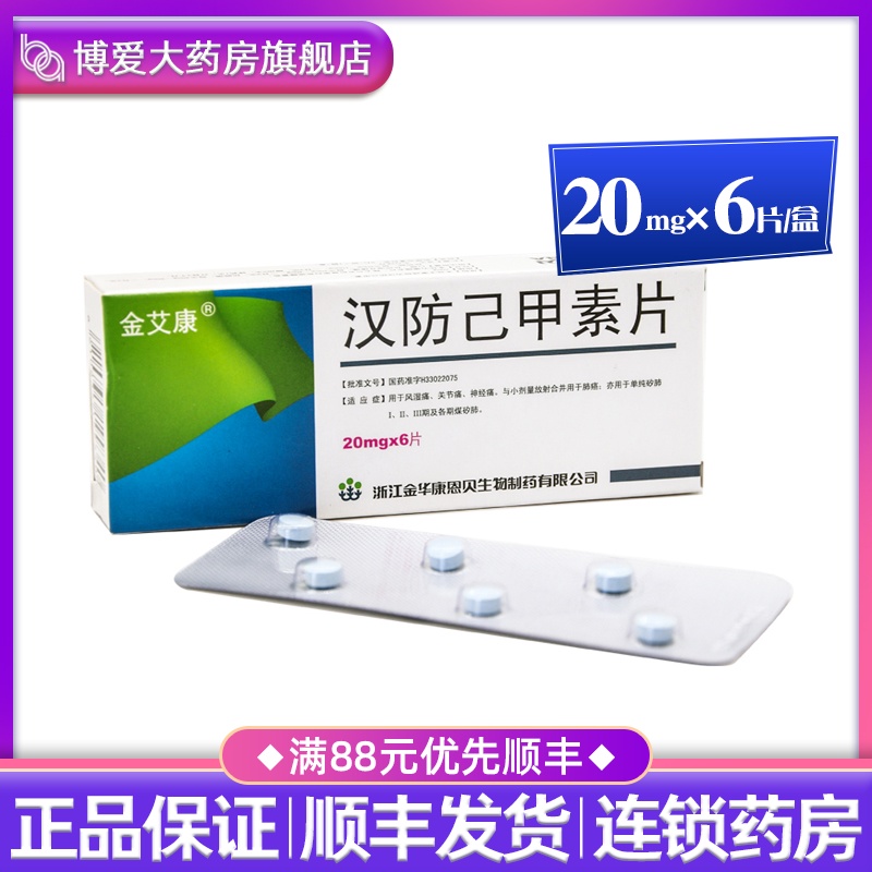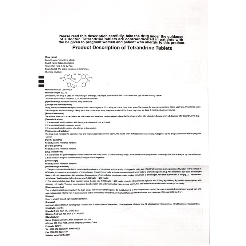 Таблетки Jinkang Tetrandrine 20 мг * 6 таблеток в упаковке, используются при ревматических болях, болях в суставах, невралгии в сочетании с низкими дозами облучения при раке легких, также используются при простом силикозе I II III и различных стадиях угольного силикоза.