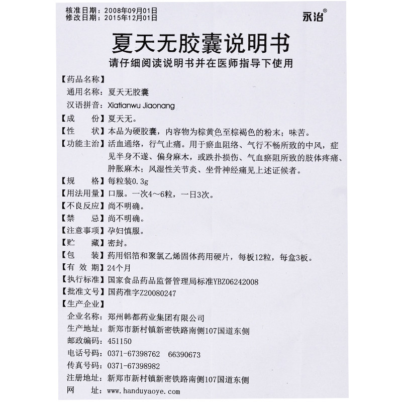 永治 Лето нет капсулы 0,3 г*36 Капсулы/коробка этого продукта способствует циркуляции крови, движению, ци и облегчению QI и облегчении ци и облегчении ударов, вызванных расстоянием, видя половину тела, онемение DA DA