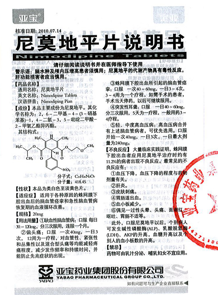 亚宝 Таблетка Nimo -пинга 20 мг50 таблетки церебрального сосудистого спазма, высокое кровяное давление, лимузиновая таблетка, нишевая пленка, таблетки нигкина