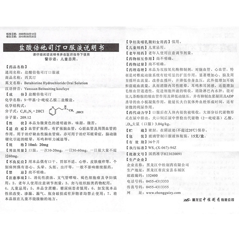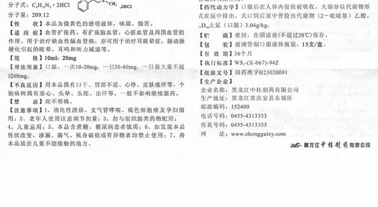 中桂 Синин -гидрохлорид гидрохлорная пероральная жидкость 10 мл: 20 мг*15 ветвей/коробки Расширение цереброваскулярной ишемической головокружительной сосудистой сосудистой сосудистой ядры и ушах