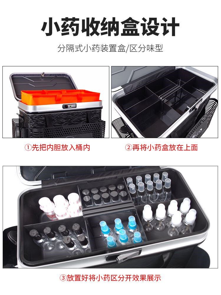 Рыбалка с коробкой твердые ящики для рыбалки пели сидят на красном оборудовании.Рыбалка твердой рыбалки на дне платформы