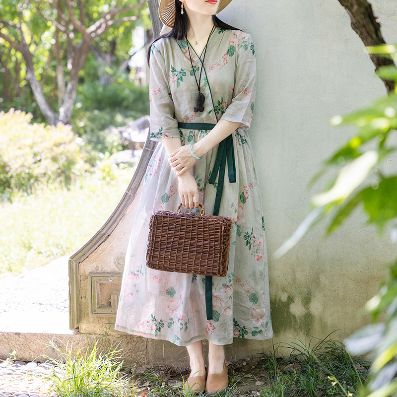 Летнее оригинальное платье, длинная юбка, высокая талия, из хлопка и льна