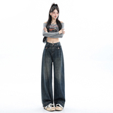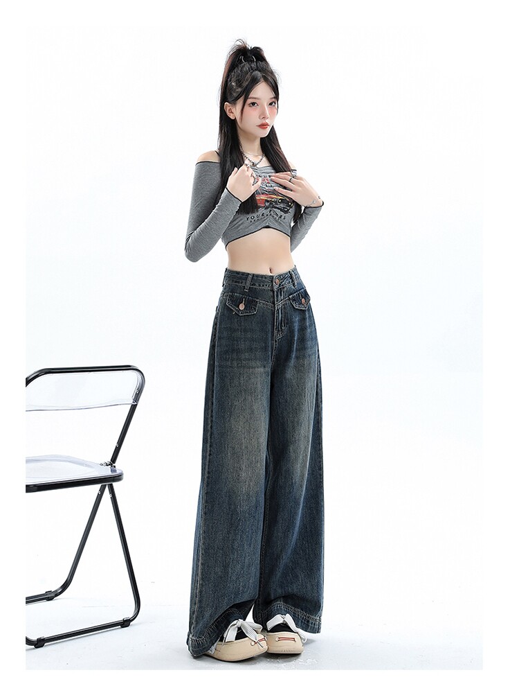 Ретро осенние джинсы, штаны, леггинсы, высокая талия, в американском стиле, по фигуре, свободный прямой крой
