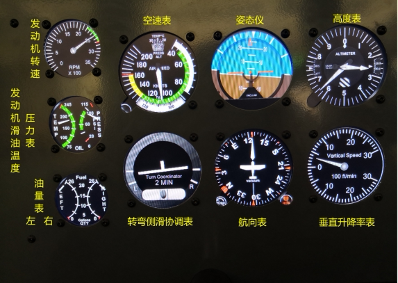 ♦ Панель управления переключателем полета: настоящая Сенна172Площадь счетчика, полный прибор включает в себя: такта, объем топлива, таблица температуры топлива и температуру выхлопных газов, давление на давление масла/Температурный измеритель, вакуумный всасывающий и ток -измеритель, воздушный измеритель, индикатор поляризатора, горизонт, радиосаман, измеритель высоты воздуха, измеритель вертикальной скорости, показатель скорости, канал/Индекс скользящих каналов, индекс канала,ADFИндикатор может отображаться одновременно