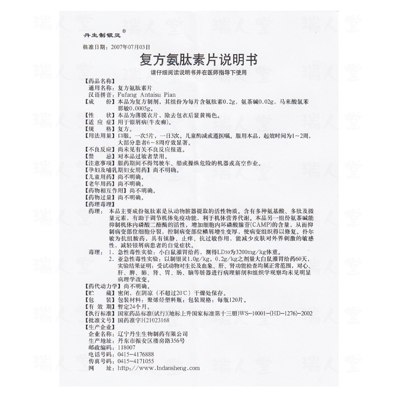 丹生制银灵 Составные таблетки аминотидина 120 таблетки/коробка псориаз Псориаз лекарства