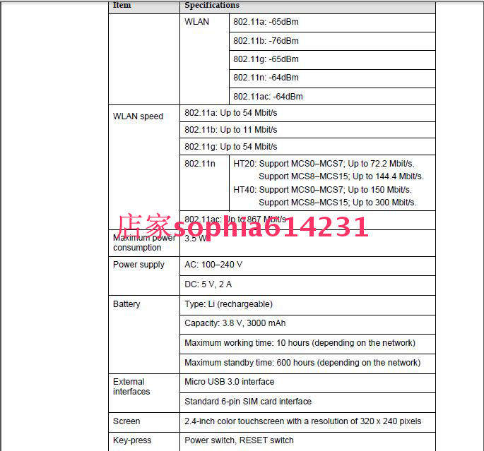 4G LTE CAT6 300 Мбит/с, загрузка 50 Мбит/с/3G DC-HSPA+ 43,2 Мбит/с, 5,76 Мбит/с. Загрузка Wi-Fi 802.11a/B/G/N/Acupare пользователи P до 10 часов работы и до 500 часов резервного периода, 3000 Батарея MAH (съемная) 2,4-дюймовый сенсорный экран с разрешением 320 x 240 пикселей.