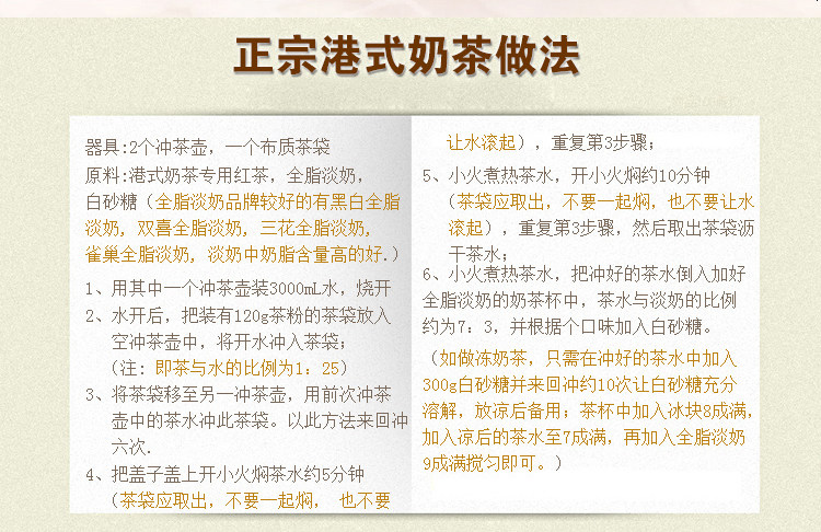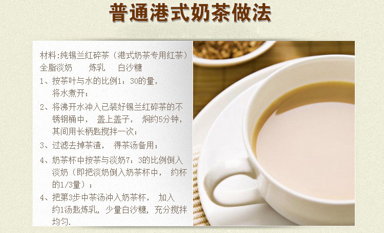 Гонконгский стильПрактика молочного чая: 45 г соотношения чая 10 000 воды.После того, как чайный суп сожжен, он хранится в одиночку.При продаже и выпивке возьмите 12 унций чашек в качестве примера от 200 мл чая+100 мл лапы+20 мл сахара фруктов+слегка утонченного молока. Хорошо перемешайте.
