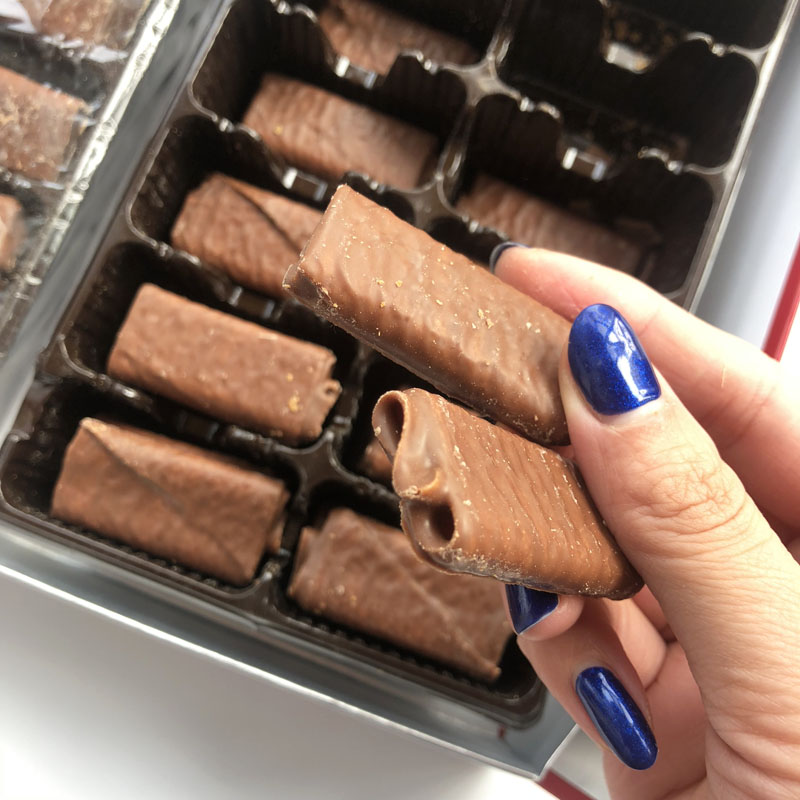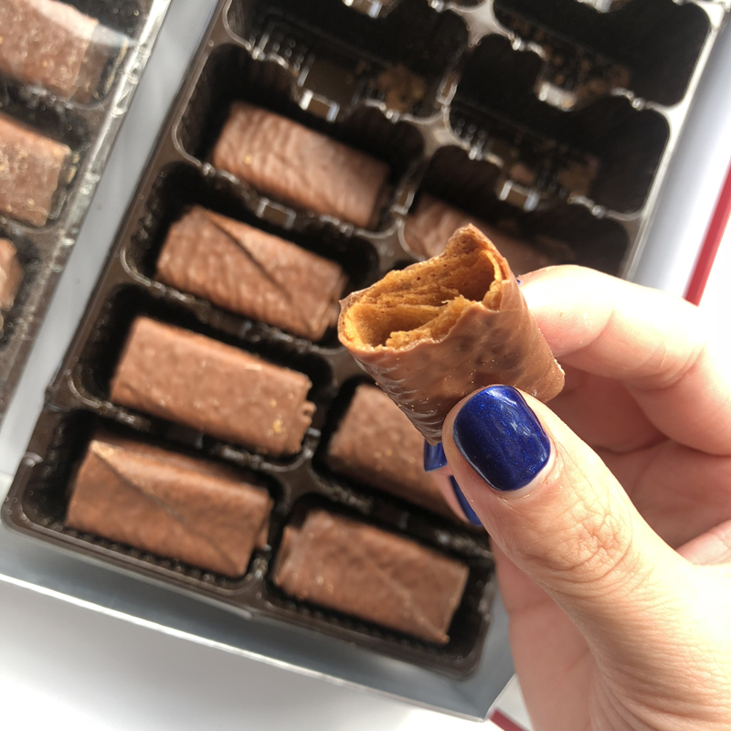 Это действительно вкусно, решайте коробку за считанные минуты, шоколад не сладкий, сладость просто правильно, завернута в очень хрустящий хрустящий торт, пусть вы возьмете его один за другим ...