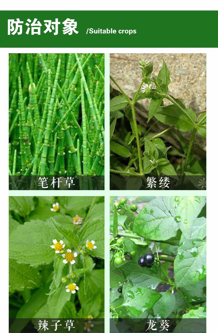 3. Виноградники и сады: (1) Лечение до или раннего после сорняков (до стадии 4-листа): 40 мл/MU.Перед проросшими и обнаруженными сорняками.Смешайте 50 кг/м.(Примечание: не распыляйте на фруктовые деревья).(2) после лечения сорняков 6 листовых стадий: 4 мл“Косить траву”+200 мл“41%глифосат”ПолемСмешайте 30-40 килограммов воды на MU.