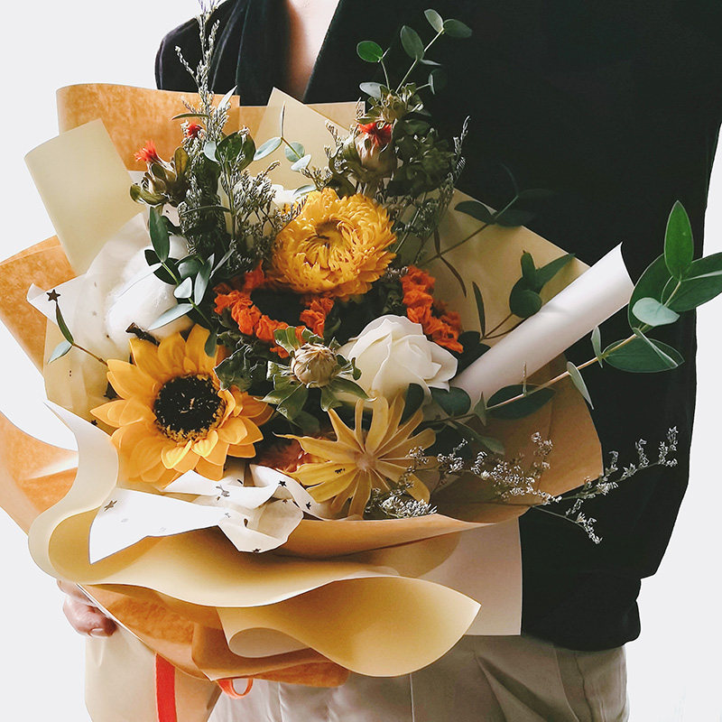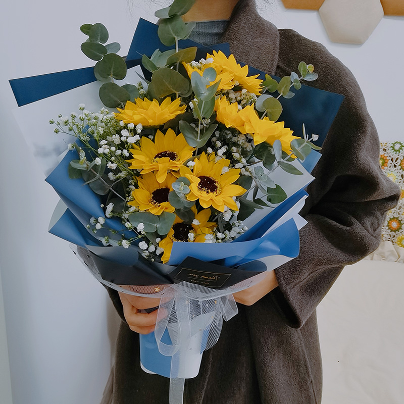 - Букет из 9 предметов с подсолнухами и гипсофилой