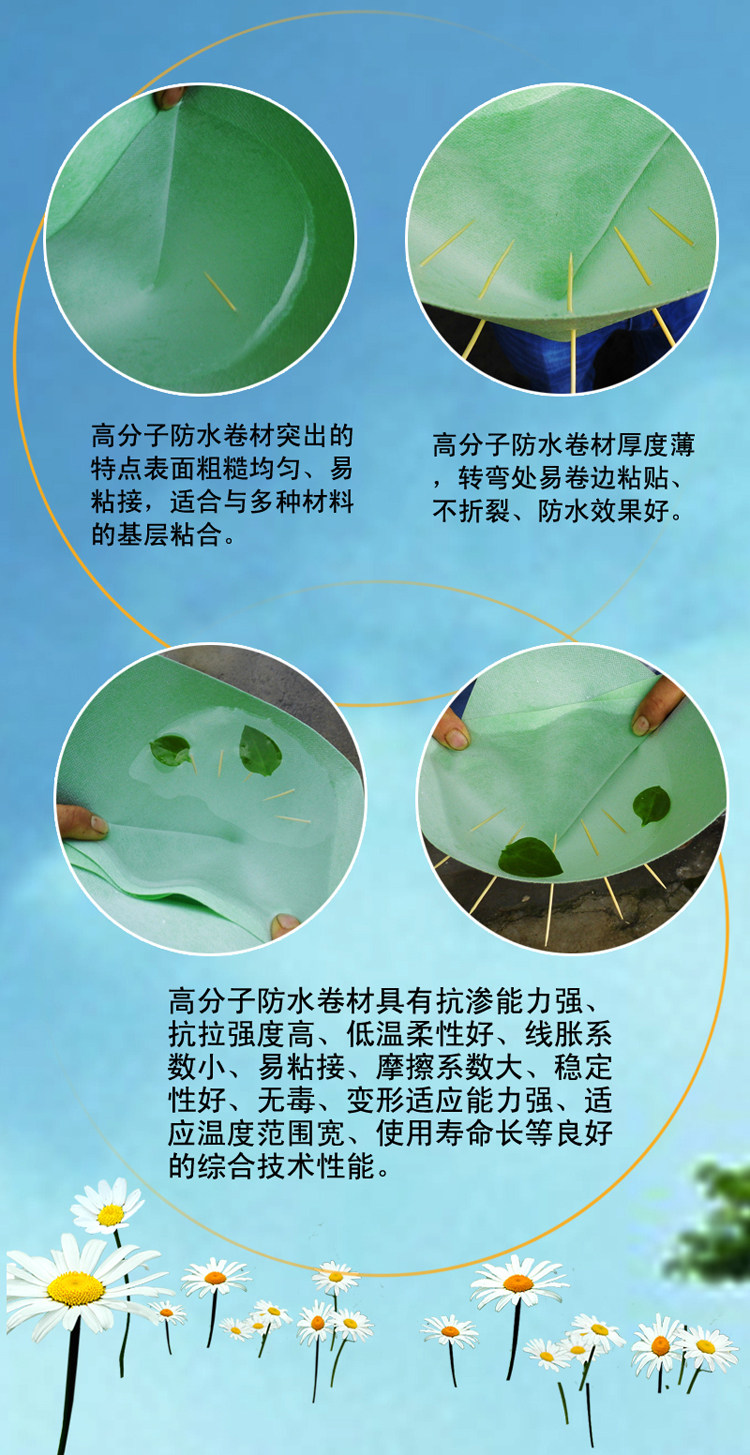 Продукты, препятствующие просачиванию, разработаны на основе новых требований современных гидроизоляционных проектов в моей стране к водонепроницаемым и противопротекающим материалам.Этот продукт представляет собой новый тип водонепроницаемого материала, изготовленный из многослойных полимерных синтетических листовых материалов и композитной обработки с использованием новых технологий и новых процессов.