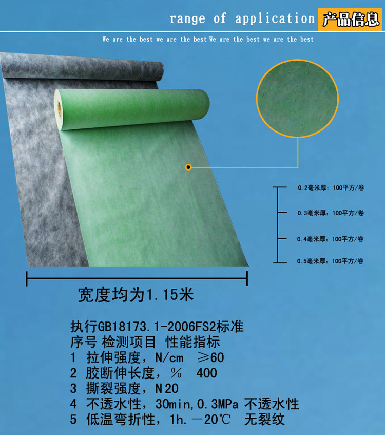 Полимерные гидроизоляционные мембраны широко используются.Он подходит не только для кровельной и подземной гидроизоляции, защиты от просачивания и влагоизоляции различных промышленных и гражданских зданий I-IV уровней, но также подходит для гидроизоляции проектов в металлургии, химической промышленности, охране окружающей среды, горнодобывающей и других отраслях промышленности.