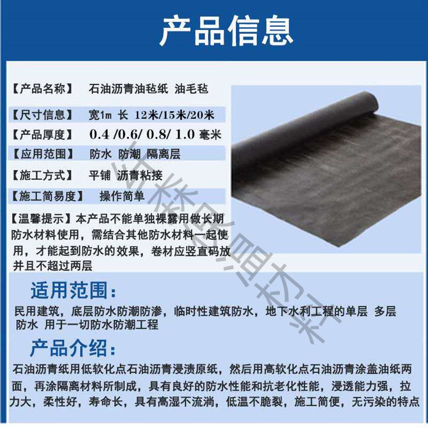 Нефтяно-асфальтовая бумага изготавливается путем пропитки бумаги-основы нефтяным асфальтом с низкой температурой размягчения, последующего покрытия обеих сторон нефтяной бумаги нефтяным асфальтом с высокой температурой размягчения, а затем покрытия или нанесения изоляционных материалов.Он обладает хорошей мягкостью, устойчивостью к старению, сильной тяговой силой и длительным сроком службы.Этот продукт не может быть использован для длинных водонепроницаемых материалов для длинных водонепроницаемых материалов. Его можно использовать только в сочетании с другими водонепроницаемыми материалами для достижения эффектов гидроизоляции.