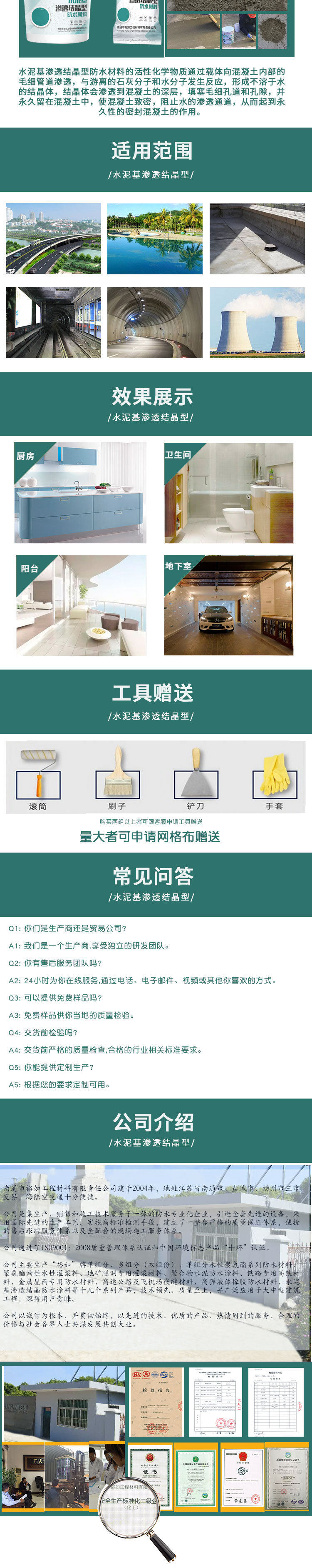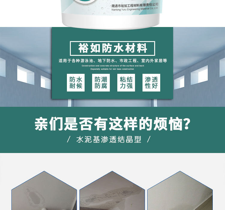 Активные химические вещества проникновения на основе цементного водонепроницаемых водонепроницаемых материалов проникают в капиллярные трубы внутри бетона через носитель, реагируют со свободными молекулами извести и молекулами воды, образуя кристалл нерастворимой воды. Бетон плотный, предотвращая проникновение канала воды, тем самым играя на постоянном уплотнении бетона.
