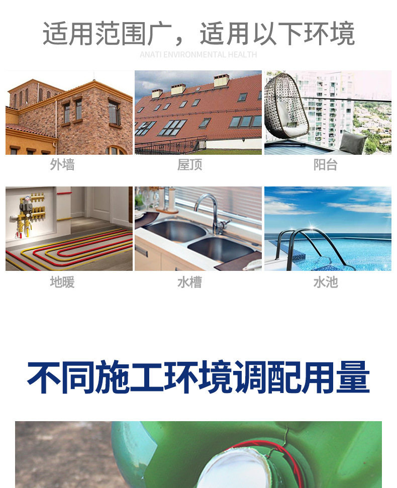 1. Широко используется для водонепроницаемых, анти -ликовых, влажных и влажных проектов, защищенных от наружных стен, туалетов и купальных комнат, бассейнов, подвалов, крыш и других зданий.