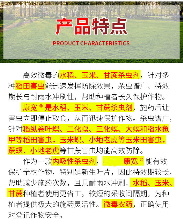 КакВнутреннее поглощениеИнсектицид, Канкуан&рег; Он может эффективно защитить весь урожай, особенно новые листья, поэтому имеет длительный эффект, помогает сократить количество применений пестицидов и устойчив к дождевой эрозии, что делает его более экономичным для производителей риса, кукурузы и сахарного тростника.Короткие интервалы сбора урожая предоставляют производителям большую гибкость применения.Слаботоксичные пестициды при правильном использовании безопасны для зарегистрированных культур.