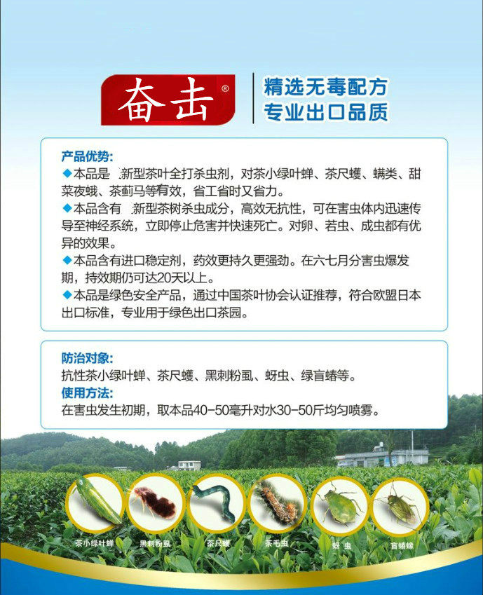 Характеристики производительности: этот продукт представляет собой композитный пестицид чайного дерева. Он оказывает хорошее влияние на маленький зеленый листовой цикада в чае.