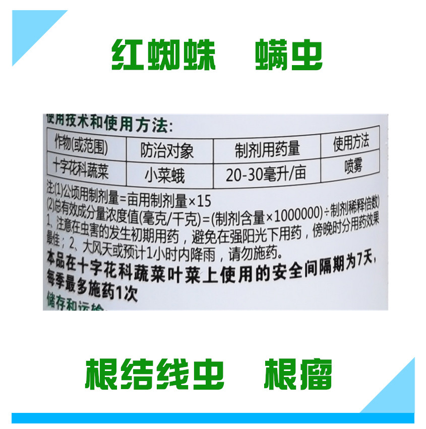 Характеристики продукта: Этот продукт обладает контактно-уничтожающим, проникающим и фумигирующим действием; Он хорошо действует на красного паутинного клеща, галловую нематоду и ромбовидную моль.