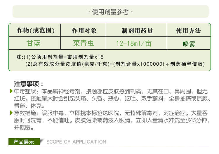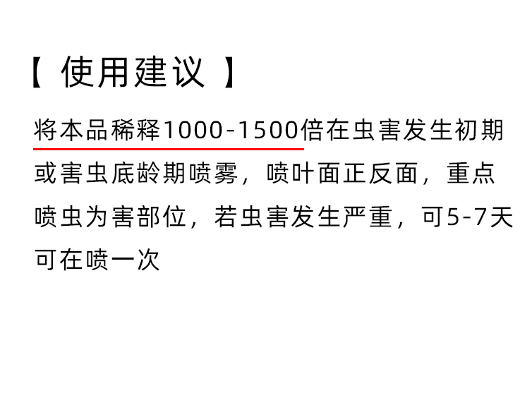 Разбавьте этот продукт 1000-1500 раз, распылите его на ранней стадии вредителей или на ранней стадии вредителей, распылите переднюю и заднюю часть листьев и сосредоточьтесь на опрыскивании вредных частей насекомых. Это снова через 5-7 дней.