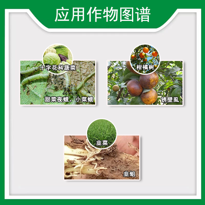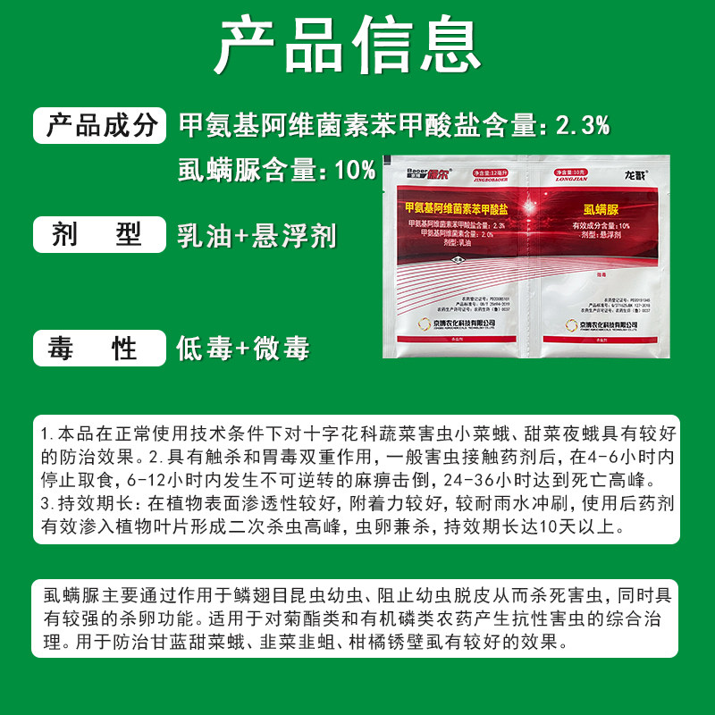 | Производительность продукта: 1. Этот препарат оказывает хорошее контрольное воздействие на вредителей крестоцветных овощей и совку свекловичную при нормальных технических условиях использования. 2. Он имеет двойной эффект: контактное убийство и желудочное отравление.Обычно после воздействия агента вредители перестают питаться в течение 4–6 часов, страдают от необратимого паралича и упадка сил в течение 6–12 часов и достигают пика гибели через 24–36 часов. 3. Длительный эффект: он обладает хорошей проницаемостью по поверхности растений, хорошей адгезией и более устойчив к дождевой эрозии.После применения средство эффективно проникает в листья растений, образуя вторичный инсектицидный пик, убивая оба яйца насекомых, и оказывает продолжительное действие более 10 дней. | ||||||||||||