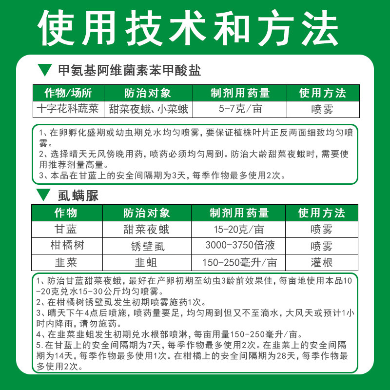 | Технические требования: 1. В период вылупления яиц или на стадии личинки смешайте воду с водой и равномерно распылите.Следите за тем, чтобы передняя и задняя стороны листьев растения были тщательно и равномерно опрысканы. 2. Опрыскивание выбирайте вечером в солнечный безветренный день.Распыление должно быть равномерным и продуманным.При борьбе со старыми Spodoptera exigua необходимо использовать рекомендованную дозировку.3. Безопасный интервал применения этого продукта на капусте составляет 3 дня, его можно использовать до 2 раз за урожай. | ||||||||||||