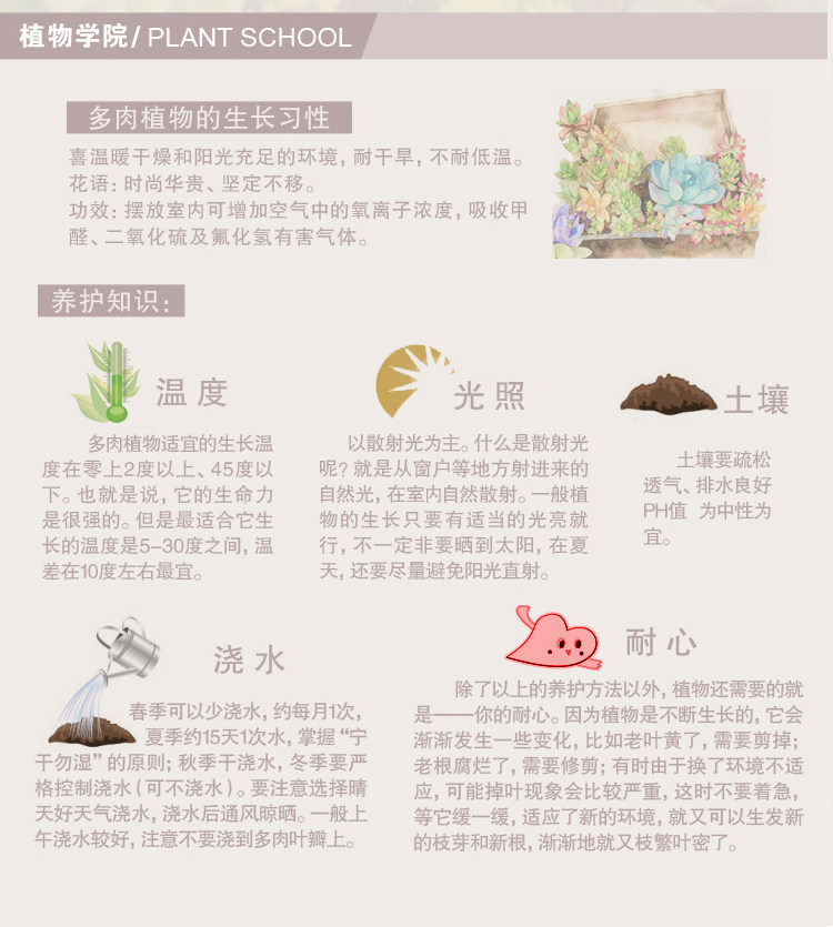 Привычки: мне нравится достаточное солнечное свет. После солнечной ванны края станут красивыми красными.Хотя свет также может расти, цвет будет скучным, а стебли будут расширяться.Страх влажности.Весна и осень - это вегетационный период, а почва горшка почти все сухая.Держите почву для горшка летом, чтобы избежать воздействия.Полив также должен быть уменьшен зимой, иначе его легко гнить.Окружающая среда тепла, сухости и вентиляции, счастливого света, устойчивости к засухе, сопротивления холодной, тени, внутренней газовой среды, сильной адаптивности, не устойчиво к воздействию солнца, без очевидных бездействий.
