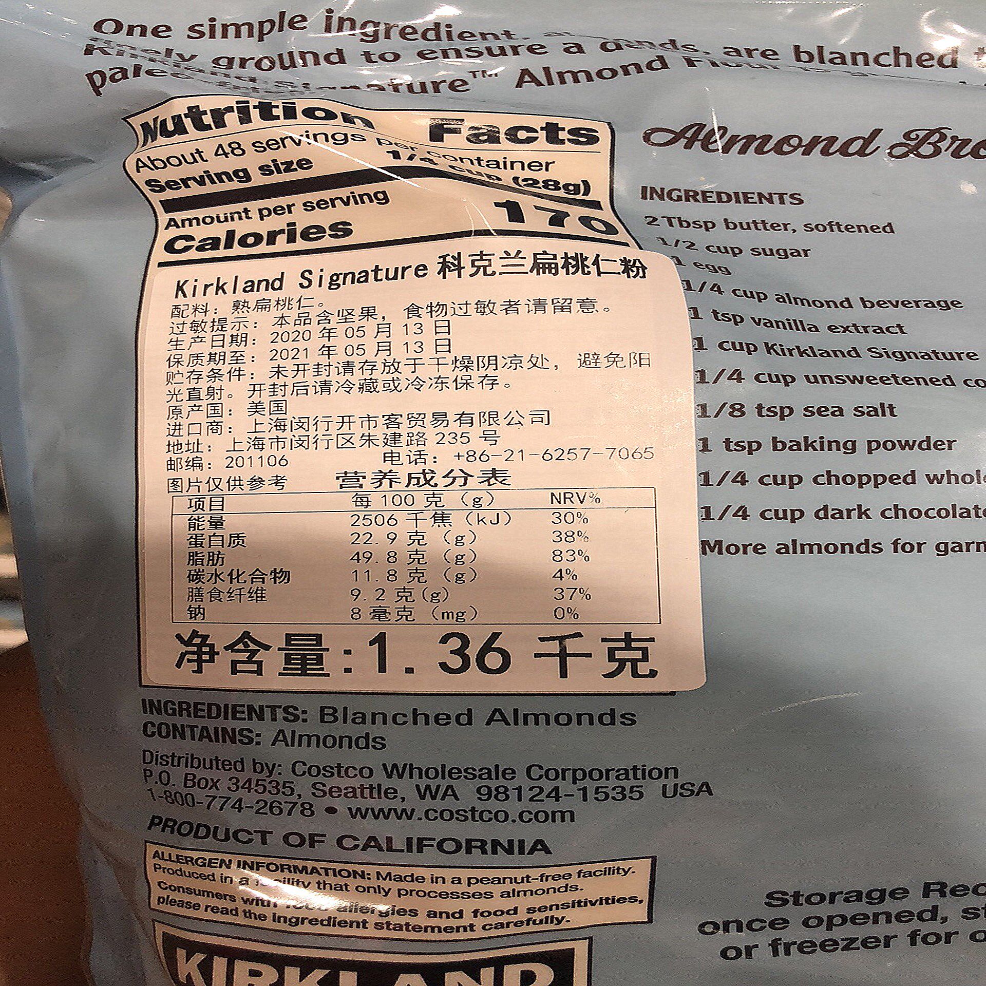 Costco приобретает Kirkland Kirkland Almond Powder C Tomondil Powder 1,36 кг