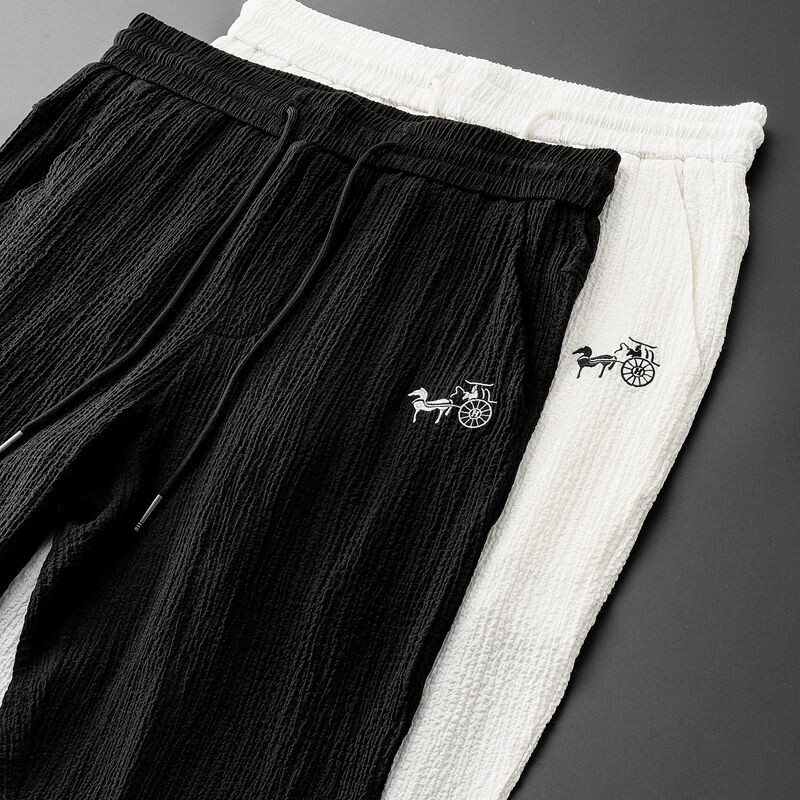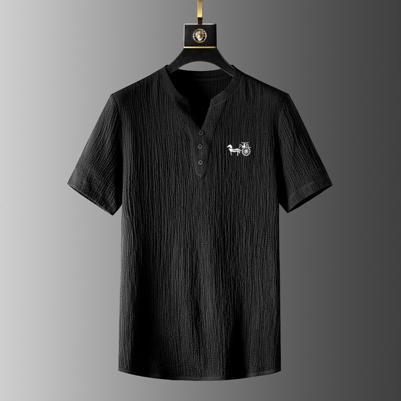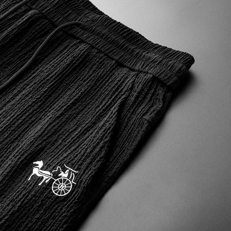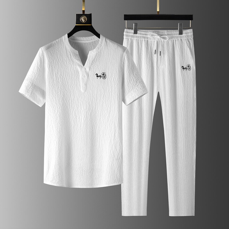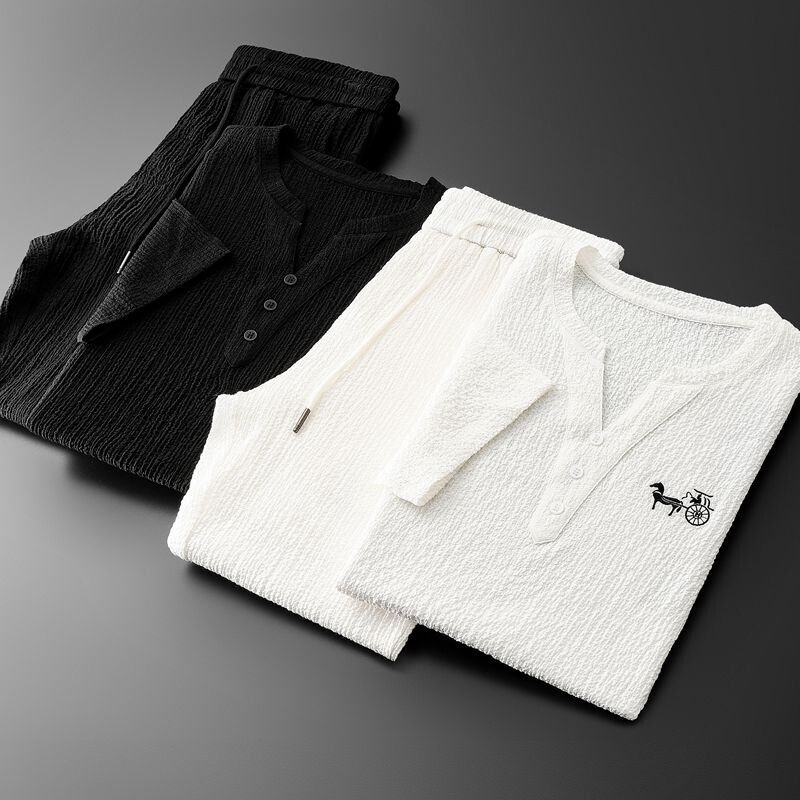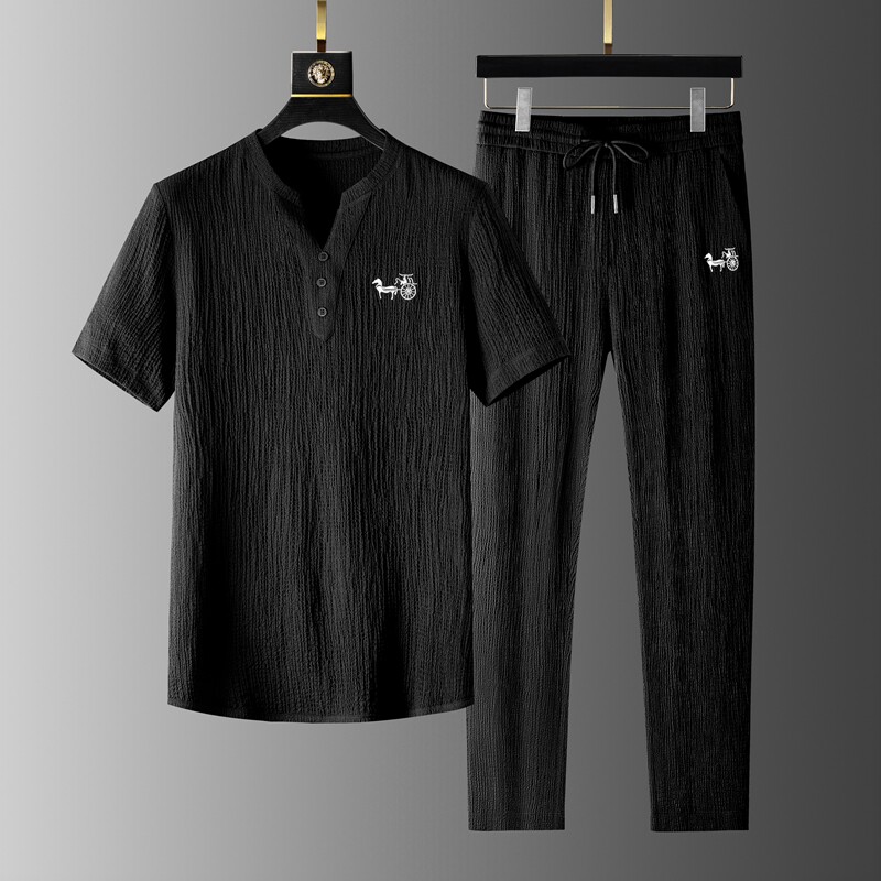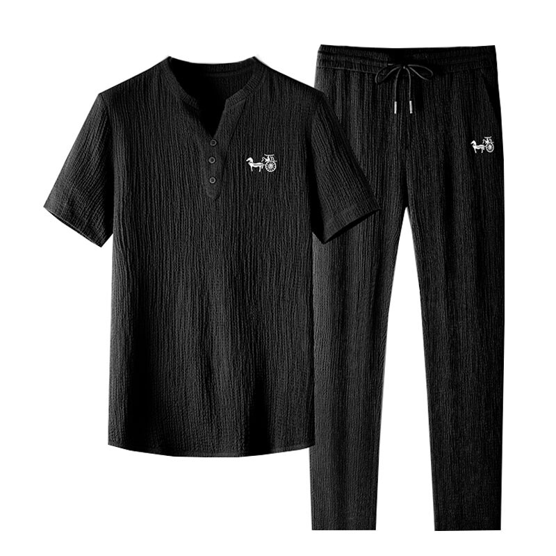Хлопковый высококлассный летний комплект, тонкий спортивный костюм для отдыха, китайский стиль, V-образный вырез, с вышивкой, облегающий крой, короткий рукав