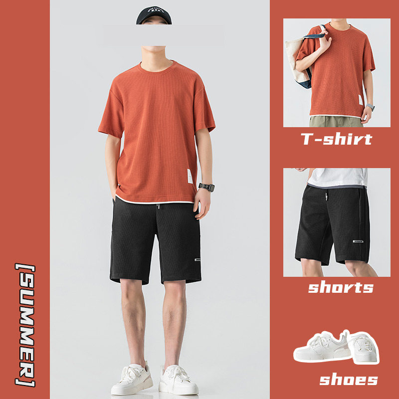 Летний комплект для отдыха, черные спортивные шорты, оверсайз, короткий рукав, на шнурках
