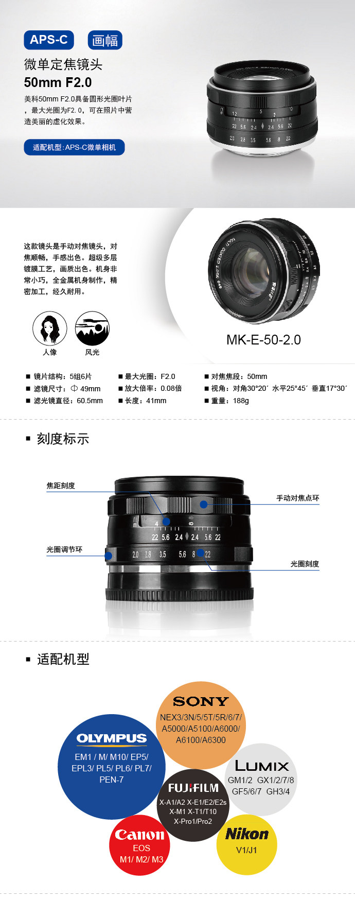 Meike Mk-50mm-F/2.0 Большая апертуру с фиксированной фокусом микросвязанные линзы адаптируются к Sony olbas panasonic fuji