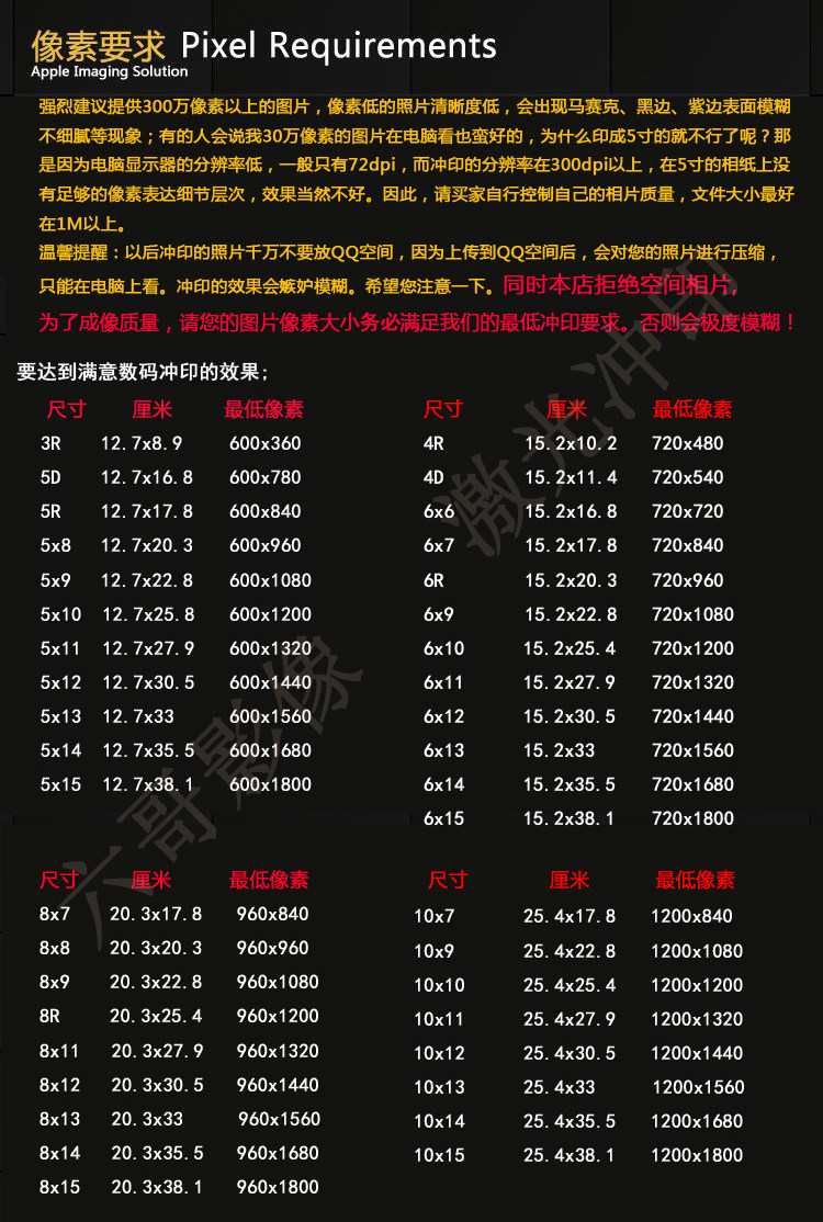 1. Настоятельно рекомендуется предоставить 3 миллиона пикселей или выше. Низкие пиксели с низкими пикселями низкие, а мозаика, черная граница, фиолетовые края, озера поверхности не деликатны и т. Д. Это будет напечатано до 5 дюймов?Это связано с тем, что разрешение компьютерного дисплея, как правило, составляет всего 72DPI, а разрешение печати выше 300 дюймов. Нет достаточно деталей выражения пикселей на 5 -дюймовой фазовой бумаге. Конечно, эффект не будет хорошим.Поэтому покупателям просят контролировать свое собственное качество фотографии.