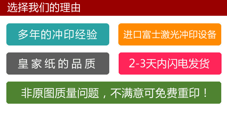 Лазерная печать после чувствительности к фотобуману может сделать цвет более реалистичным, картина более четкая, и ее можно долго хранить без исчезновения.И мы используем импортируемые лазерные машины с высоким содержанием Fuji и оригинальную печатную лекарственную воду, что может сделать эффект визуализации достигать более совершенного уровня!