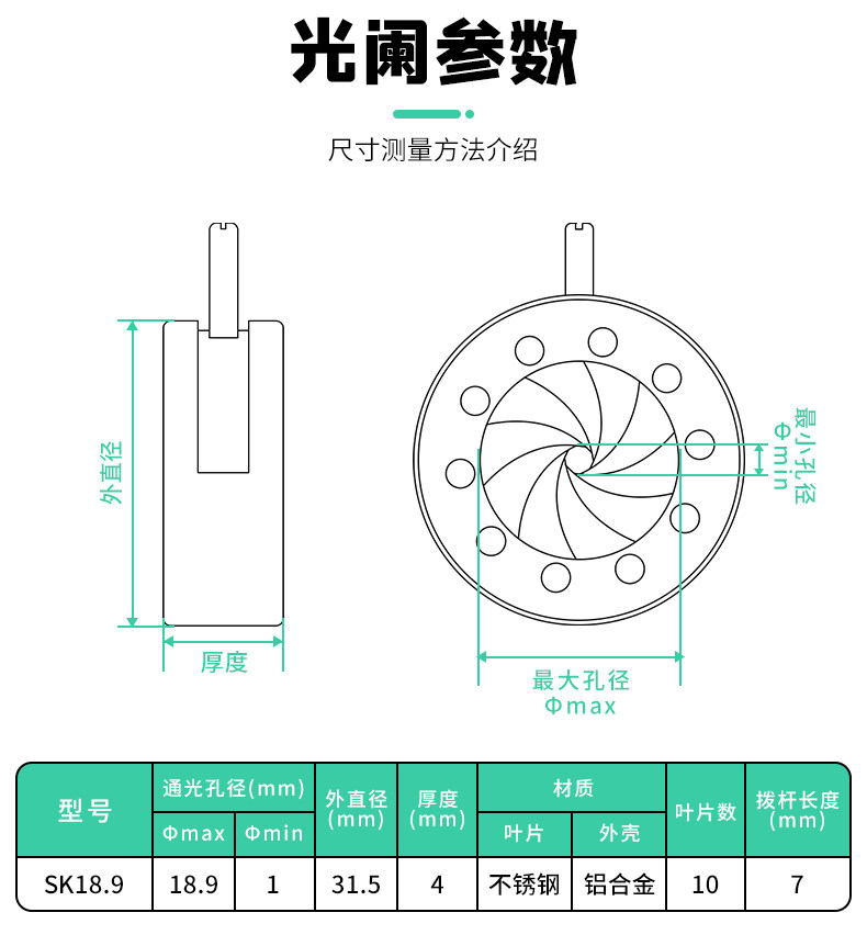 Модуль диафрагмы SK189, встроенный регулируемый свет, ручная диафрагма, переменная диафрагма 1–18,9 мм, матовая ирисовая диафрагма, темная