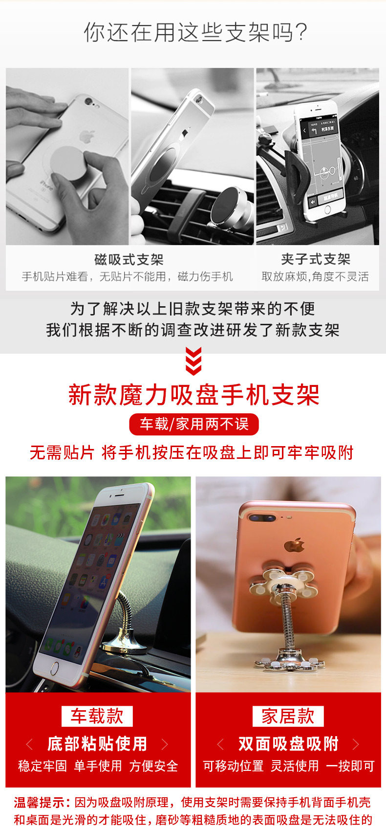 Стабильность всасывания нестабильна.Обычные пластиковые плоскости, адсорб в течение нескольких минут.Не -smooth рабочего стола время адсорбции короче.Мобильный телефон также является, если задняя часть времени - это зеркальное стекло, адсорб в течение десятков минут.Легкий пластиковый корпус мобильного телефона может быть адсорбирован только в течение нескольких минут.(Основываясь на плоскостном уровне, не существует времени адсорбции.) Так что этот продукт не учитывается, но почему продажи горячо?Несколько дней назад глава железнодорожной компании, ответственный за специальные продажи поездов, также связался с нами, заявив, что поезд был хуже, и рынок был признан.--- Если вы против своих клиентов, я не рекомендую вам покупать его.Если вы продаете бизнес, вы можете быть уверены.