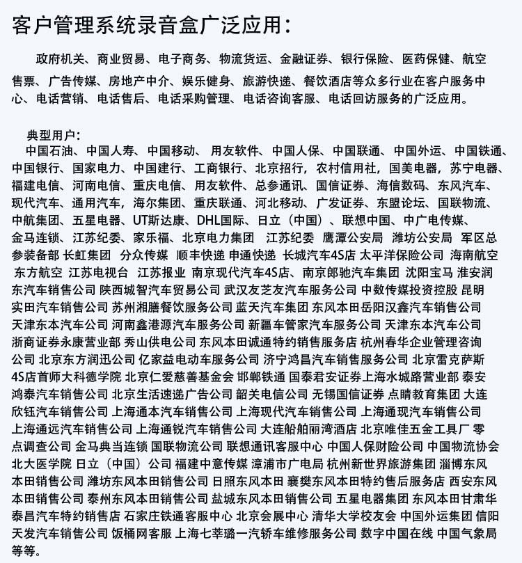 1Супер небольшие требования к хранению: автоматически записываться на компьютер, весь номер телефона 8 последовательных часов в день записывается только как 200 -метровый жесткий диск, и он имеет расширенные функции управления, извлеченные в любое время, извлекает, расслабляется, сжатие, перемещение, и сжигать -ин. Удалить и резервное копирование; вы можете выбрать ручную запись или вы можете выбрать автоматическую запись