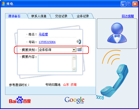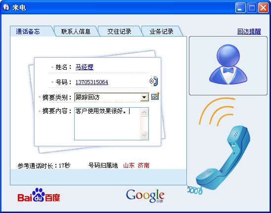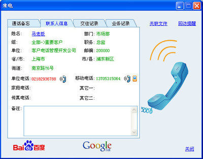 2. При звонке и звонке информация клиента автоматически воспроизводит экран, чтобы ускорить эффективность обработки бизнеса; базовая информация и исторические обмены клиента (Call, Short&&Письмо), записи бизнес -порядка и другая информация все ясны с первого взгляда, так что вы можете иметь много ума перед разговором, который может эффективно избавиться от разрыва в расстоянии, но также помочь понять инициативу разговора.Принадлежность звонка автоматически отображается на интерфейсе экрана. Нажмите на мышь в интерфейсе экрана, и вы можете автоматически открыть информацию о поиске веб -сайта (Baidu, Google), чтобы автоматически открыть номер вызова, чтобы помочь вам полностью понять странных клиентов.
