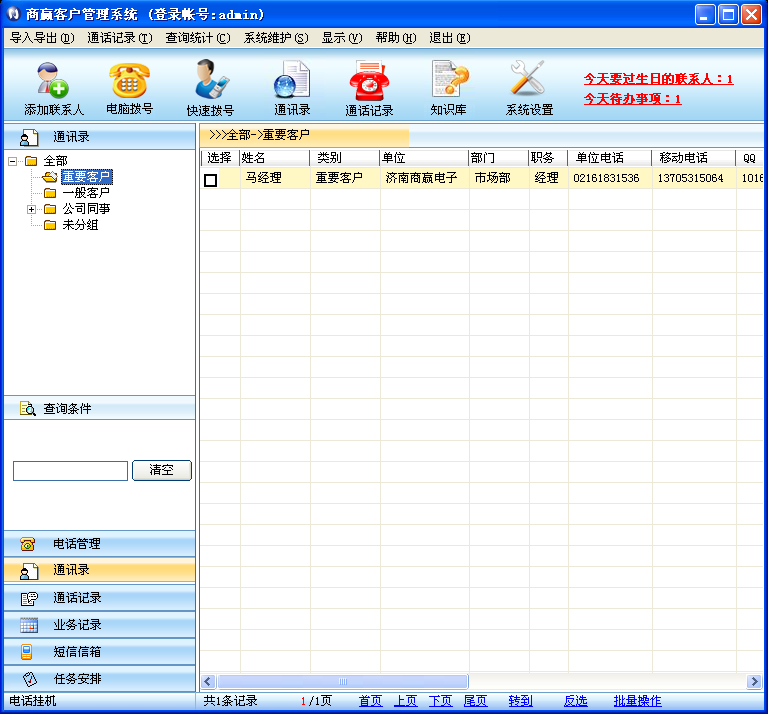 Напоминание о день рождения:После того, как функция напоминания на день рождения включена, когда сегодня появится клиент на день рождения, информация о приглашении на глаз будет отображаться в правом верхнем углу основного интерфейса системы“Контактный человек, чтобы отпраздновать день рождения сегодня:*&Rdquo;, щелкните краткий информационный контент в мышке, адресная книга будет отфильтрована, чтобы показать информацию о клиенте, которая будет отмечать сегодня день рождения: