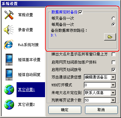 Автоматическое резервное копирование базы данных фиксированное время:Вы можете настраивать базу данных каждую неделю или месяц.Информация о клиентах, записи звонков, бизнес -записи, рефераты вызова и т. Д. В базе данных.Вы можете указать путь резервного копирования базы данных: