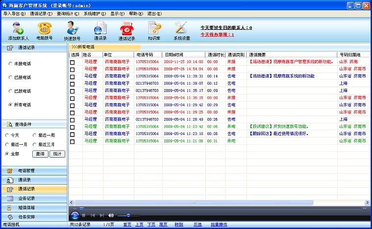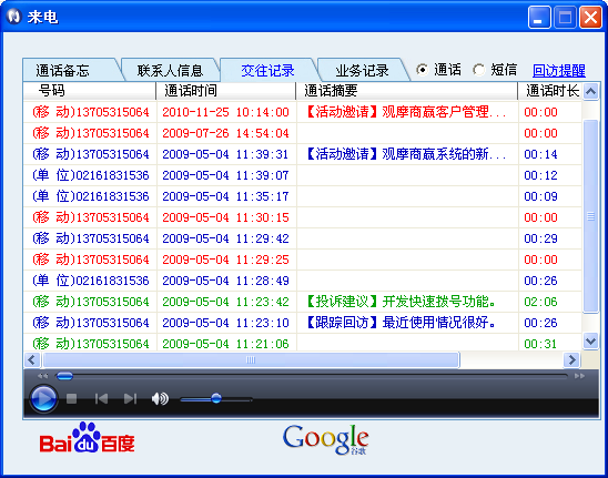 Звоните в записи:В соответствии с вариантами этого, на прошлой неделе и в прошлом месяце, параметры или вызовы, параметры типа вызовов классифицируются и отображаются, и каждые записи вызовов могут быть отредактированы соответствующие резюме вызова, что более удобно для вашего управления вызовом записиДважды -щелкните записи вызовов. Вы можете использовать Microsoft Media Player (Windows Media Player), который встроен в систему управления клиентами Shanging.