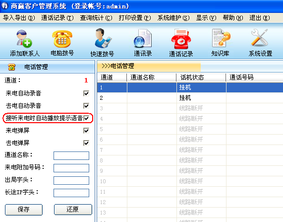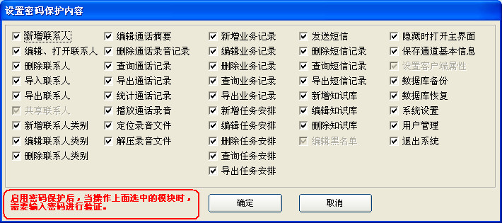 защита паролем:Если вы включите функцию защиты пароля, вам нужна проверка пароля при удалении информации, редактировании информации, записи прослушивания, выходе из системы и других операциях; только введен только пароль для входа в систему.Гарантировать в определенной степениShanging System управления клиентамиБезопасность операции предотвращена украденным неродным персоналом.