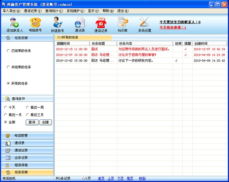 Напоминание о постановлении задачи:Редактор задача должна быть запланирована в день или в последние дни, чтобы сформировать задачу в системе управления клиентами, и настроить ее“ включить напоминание&Rdquo; как только задача закончится, система управления клиентами будет своевременно напоминать вам, чтобы избежать утечки и планирования и стать мощным помощником вашего офиса.Есть еще над основным интерфейсом системыФункция напоминания, которая будет обработана сегодня. Когда клиент вернулся к посещению или другим задачам, напоминает о красном шрифте, нажмите на напоминание, чтобы показать содержание офиса.