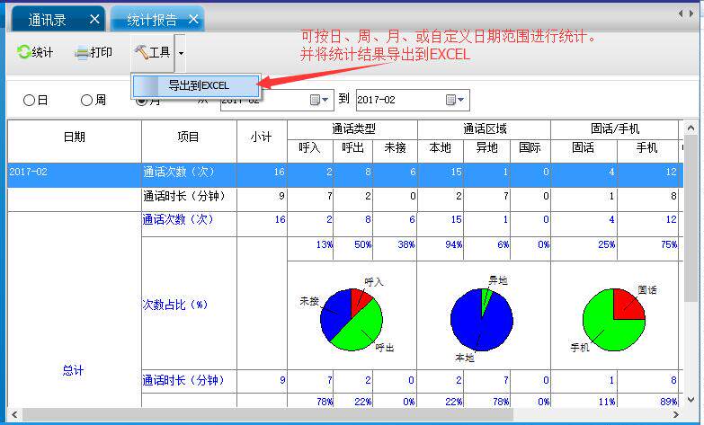 14Позвоните в статистику:Он может проанализировать вызовы в течение периода/неделя/месяц/месяц/месяц/пользовательский диапазон времени запроса и поддержать экспорт в Excel.