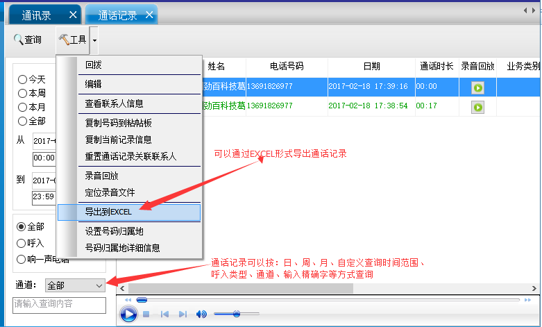 11. ЗвонитеВы можете проверить запись вызовов, которые вы хотите запрашивать различными методами, такими как день/неделя/месяц/месяц/пользовательский диапазон времени запроса/номер канала/тип вызовов/пользовательское поле и другие методы. Execl,