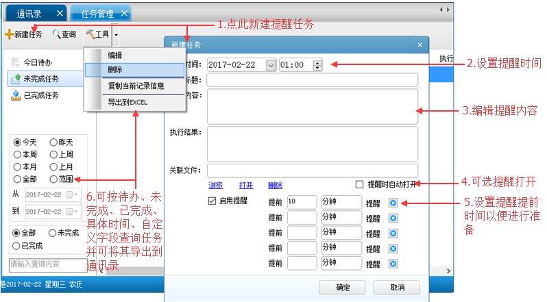 13. Напоминание о миссии:Вы можете напомнить задачу контакта для контакта, и система автоматически выпрыгнет из диалогового окна «Напоминание» в правом нижнем углу рабочего стола в соответствии с временем настройки.