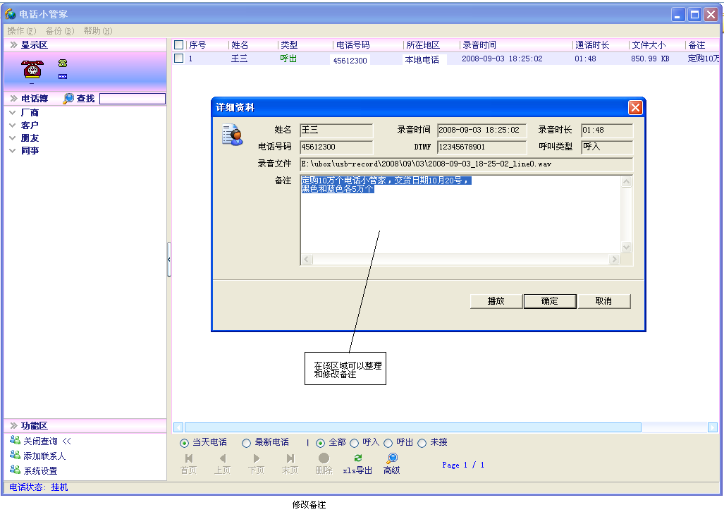 Во время вызова вы можете записать некоторую важную информацию о вызове в записи вызова в соответствии с рис. 13.существовать“ обычные настройки”“ введите вызов и автоматически всплывает вход примечания&rdquo“ запустите телефон и автоматически всплывает ввод замечаний”, когда телефонные звонки и вызовы, он появится автоматически“ редактировать телефонные замечания” диалоговое окно.Если“ обычные настройки” нет ставки на поп -up, или когда телефон времена времени, левая кнопка мыши нажмите на верхний правый угол области отображения телефона&Ldquo; Блокнот&Ldquo; Icon также выявляется диалоговое окно по вызову телефона.