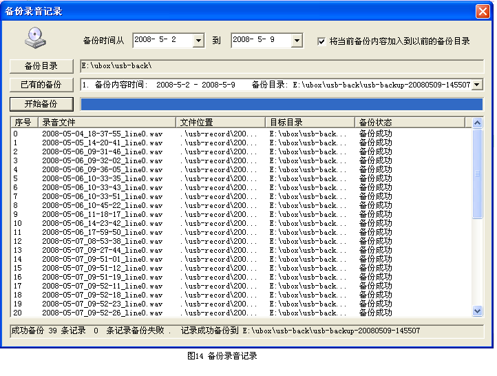 в главном интерфейсе&Ldquo; резервная копия” меню, выберите“ резервные записи записи&Rdquo;, как показано на рисунке 14, время резервного копирования по умолчанию составляет за последние 7 дней, и пользователи могут выбрать время.Если в текущем каталоге резервного копирования уже есть резервная запись, это“ существующая резервная копия&Rdquo; Китай будет отображать связанную информацию.Щелкнул“ начать резервную копию&Rdquo; и завершить эту резервную копию.Если вы выберете рядом с временем резервного копирования&Ldquo; добавить текущий контент резервного копирования в предыдущую резервную запись&Rdquo;, добавит эту резервную копию к отображаемому в настоящее время резервной копии.Если в текущем каталоге нет резервного отображения, пожалуйста, не выбирайте&Ldquo; добавить текущий контент резервного копирования в предыдущую резервную запись”, иначе нажмите“ начать резервную копию”, он появится“ нет существующей резервной копии&Rdquo; приглашение ошибки.