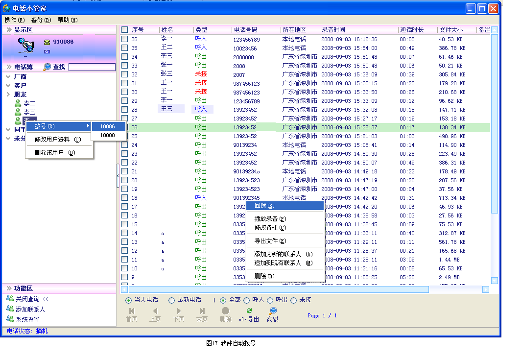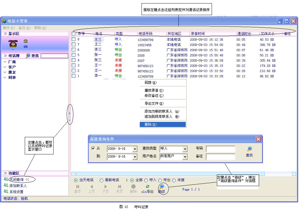 ● Удалить записи вызовов, а также удалить его файл записи.Существует два способа удаления, метод 1: зацепите номер записи, который необходимо удалить, и нажмите на левую кнопку мыши в области запроса“ удалить&Rdquo;, выбранные записи были удалены.Метод 2: В области отображения записи вызовов, в записи, которую вы хотите удалить, справа -нажмите на щелчок мыши и выберите“ удалить&Rdquo; вы можете напрямую удалить запись.