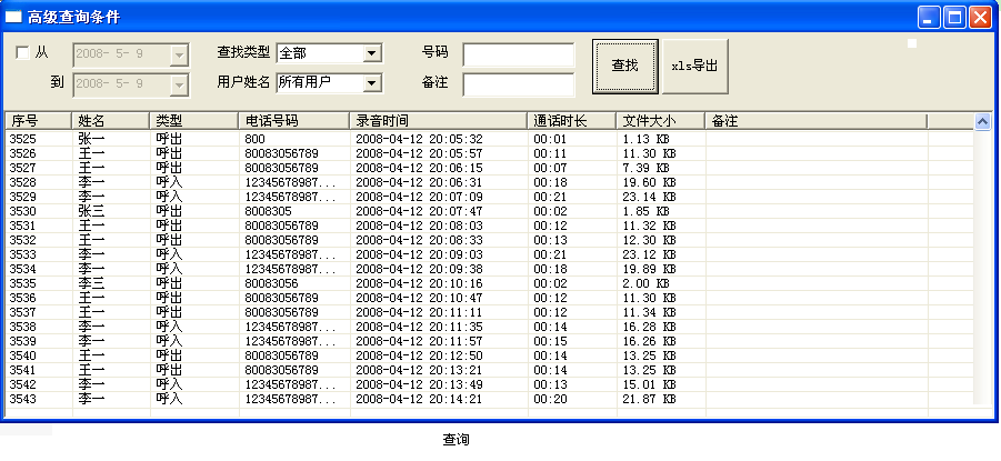щелкните в основном интерфейсе&Ldquo; операция—>Запись звонка” или в функциональной области, нажмите“ Query Record&Rdquo; и покажите, как показано на рисунке 12.В зоне запроса есть“ телефон в тот день&rdquo“ последний номер телефона” кнопка, тип телефона справа“ все&rdquo“&rdquo“ выдох&rdquo“ не связанный” кнопка.