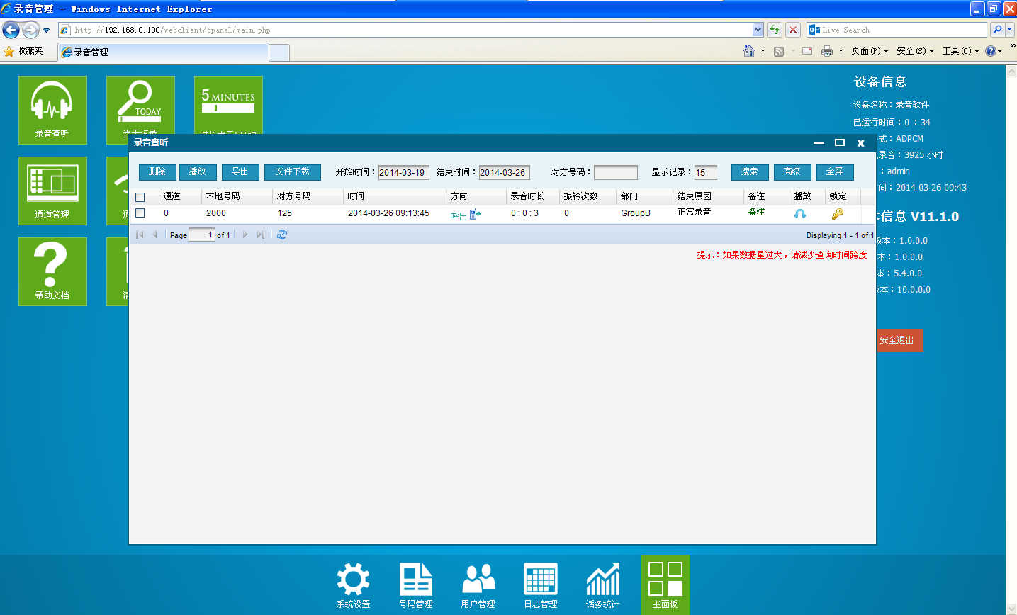 Запись поиск: осознайте быструю запись поиска.Согласно номеру канала, дата звонка, время, основной номер вызова и т. Д., Запись записи.